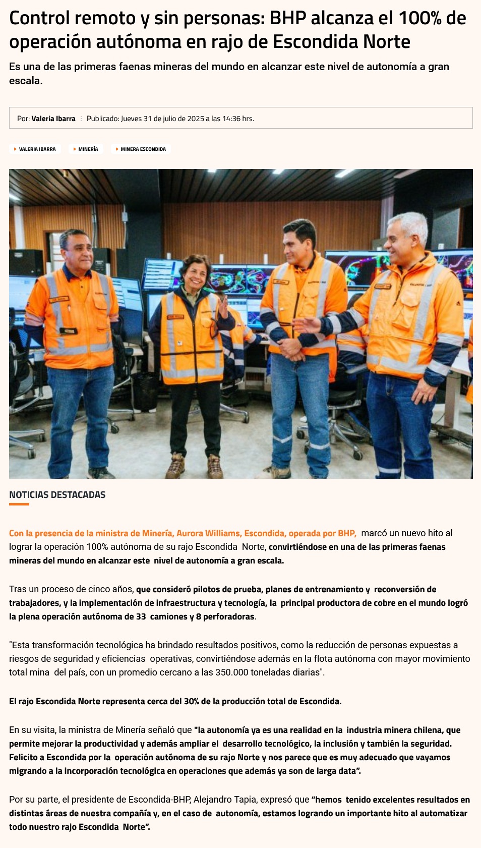 BHP automatiza la operación de camiones mineros y perforadoras de Escondida Norte - (El Mercurio de Antofagasta)
