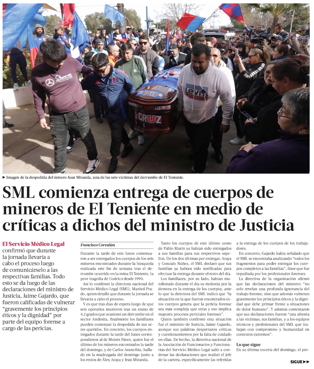 Tras reclamo por demora, SML entrega restos de todos los mineros fallecidos en El Teniente - (El Mercurio de Santiago)