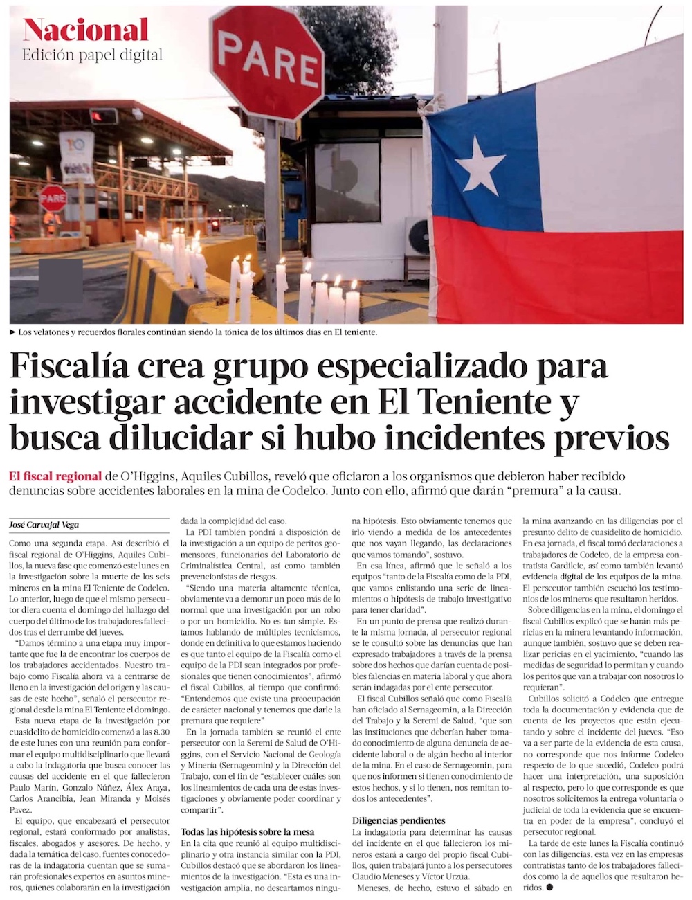 El Teniente tras la tragedia: “El plan de desarrollo debe ser revisado” - (Diario Financiero)