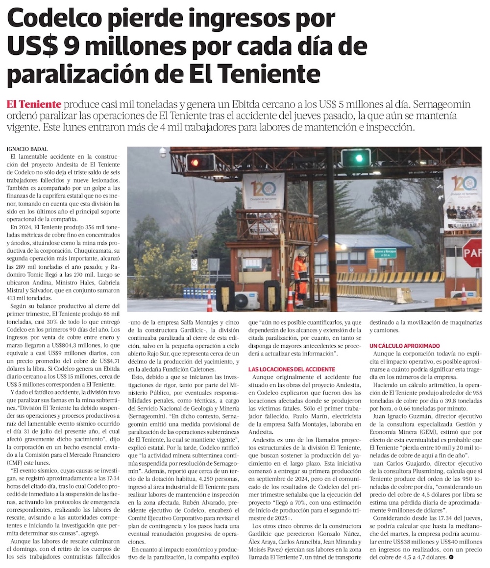 El Teniente tras la tragedia: “El plan de desarrollo debe ser revisado” - (Diario Financiero)