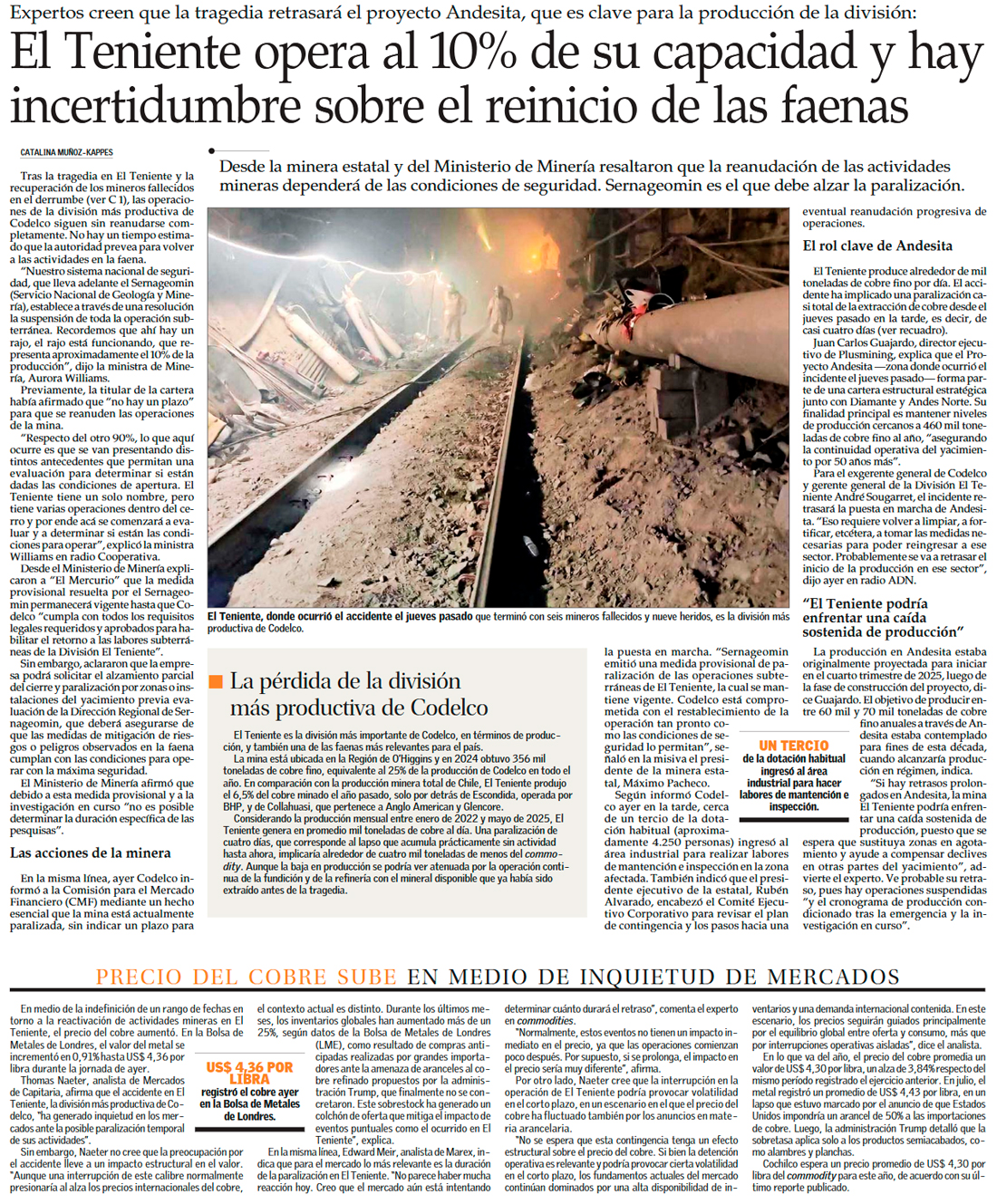 El Teniente tras la tragedia: “El plan de desarrollo debe ser revisado” - (Diario Financiero)