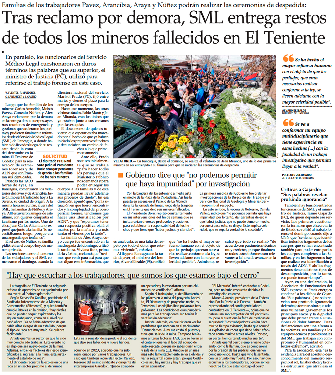 SML comienza entrega de cuerpos de mineros de El Teniente en medio de críticas a dichos del ministro de Justicia - (La Tercera)