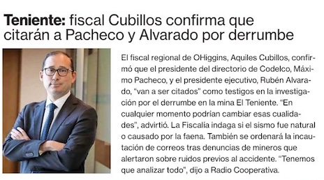 Fiscalía alista visita a mina El Teniente para levantar evidencia y citará a declarar a Máximo Pacheco - (La Tercera)