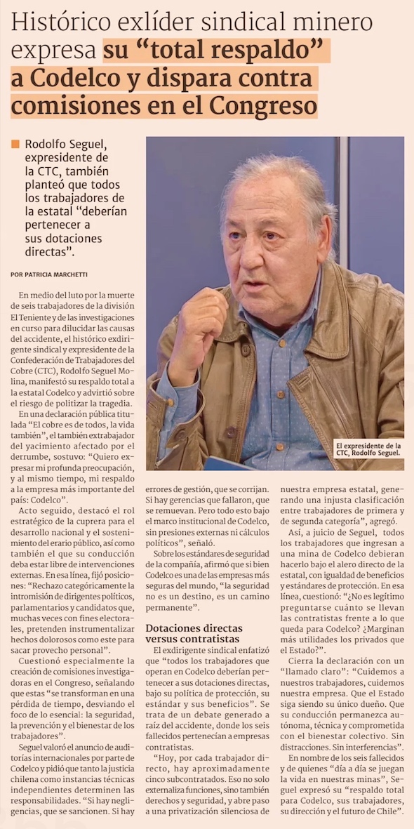 El Teniente: Investigadores bajan hoy a la mina por peritajes y prevén materias “sumamente complejas” - (El Mercurio de Santiago)