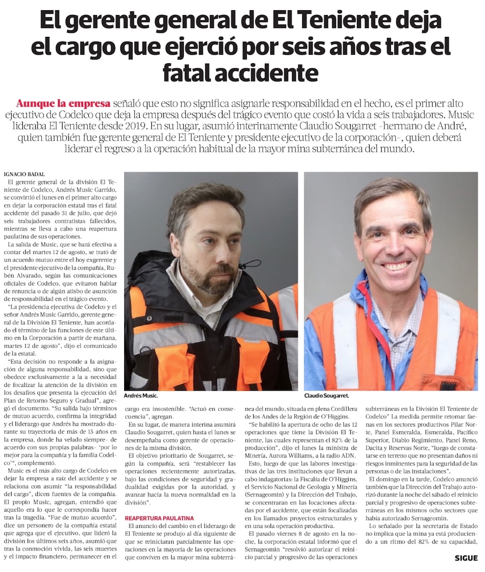 En medio de investigaciones por accidente fatal, sale de su cargo el gerente general de El Teniente - (El Mercurio de Santiago)