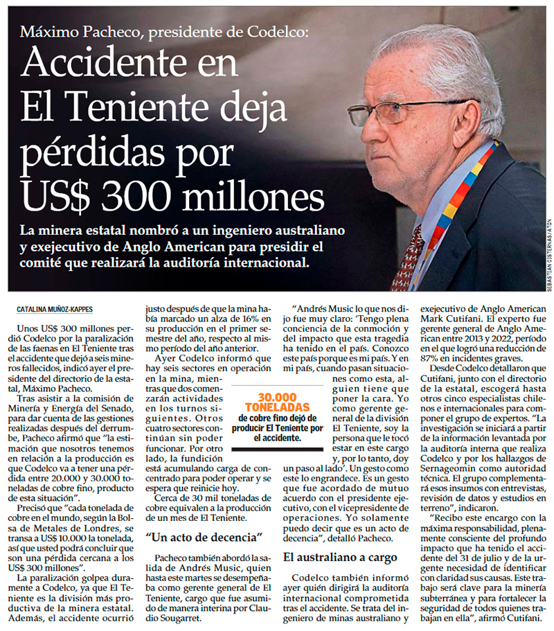 Máximo Pacheco cifra en US$300 millones las pérdidas de Codelco por efecto del trágico accidente en El Teniente - (Pulso)
