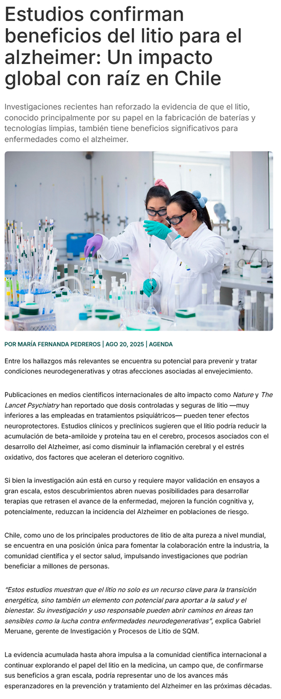 Estudios confirman beneficios del litio para el alzheimer: un impacto global con raíz en Chile - (El Longino de Alto Hospicio)