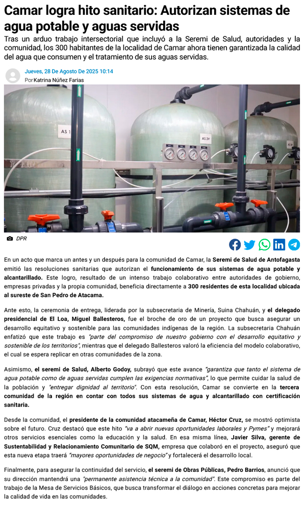 Región de Antofagasta: autorizan sistemas de agua potable y servidas para localidad de Camar - (timeline)