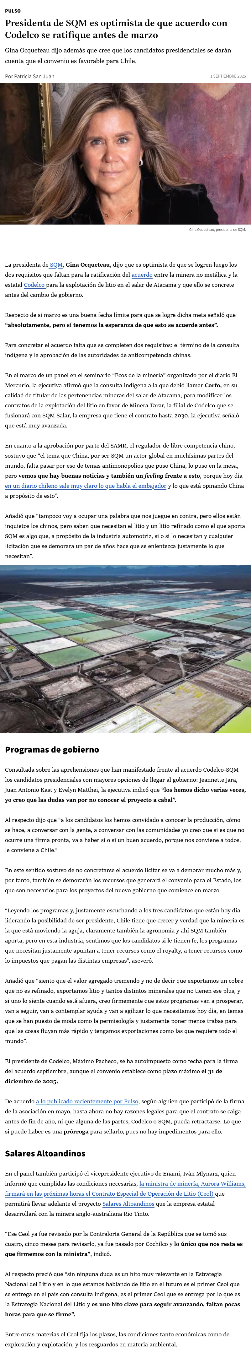 Presidenta de SQM es optimista de que acuerdo con Codelco se ratifique antes de marzo - (Pulso)