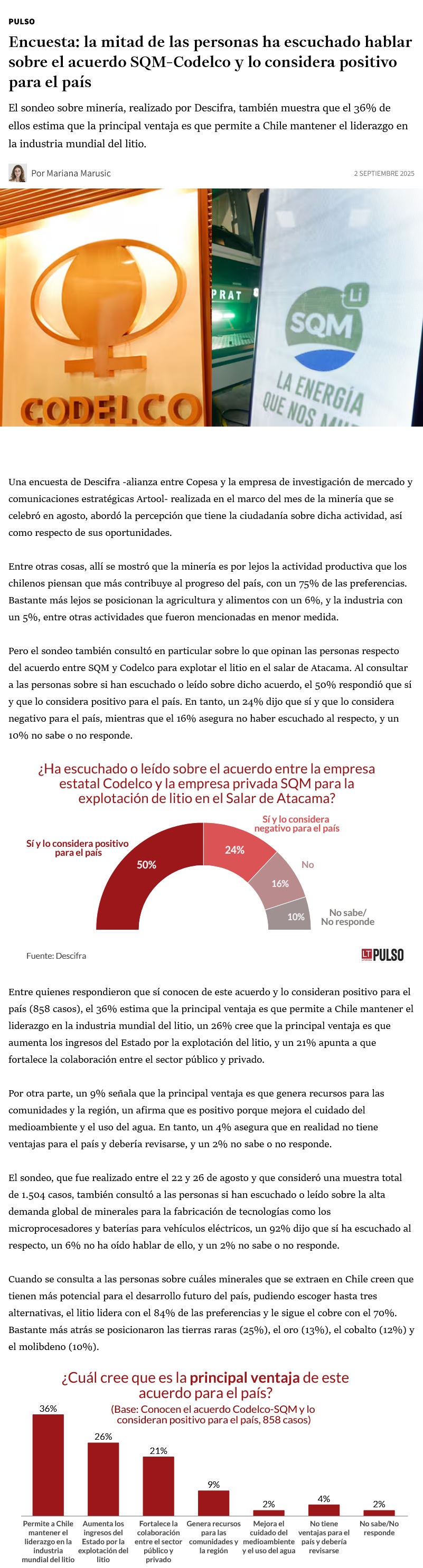 Encuesta: la mitad de las personas ha escuchado hablar sobre el acuerdo SQM-Codelco y lo considera positivo para el país - (Pulso)