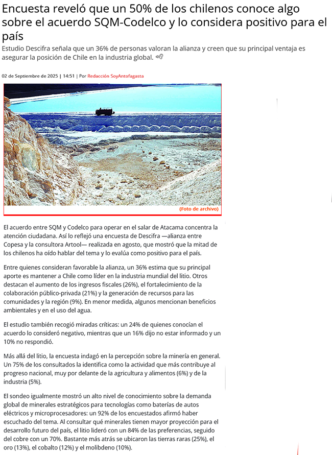 Encuesta: la mitad de las personas ha escuchado hablar sobre el acuerdo SQM-Codelco y lo considera positivo para el país - (Pulso)