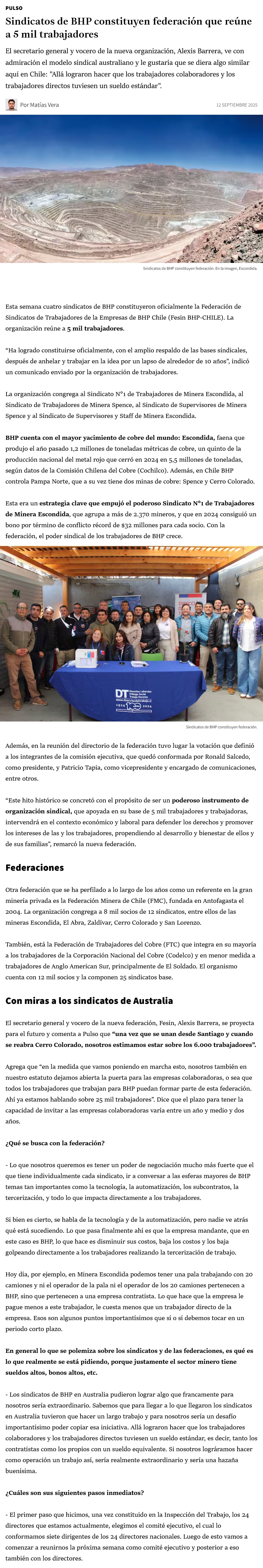 Sindicatos de BHP constituyen federación que reúne a 5 mil trabajadores - (Pulso Online)