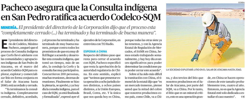 Pacheco asegura que la Consulta indígena en San Pedro ratifica acuerdo Codelco-SQM - (El Mercurio de Calama)