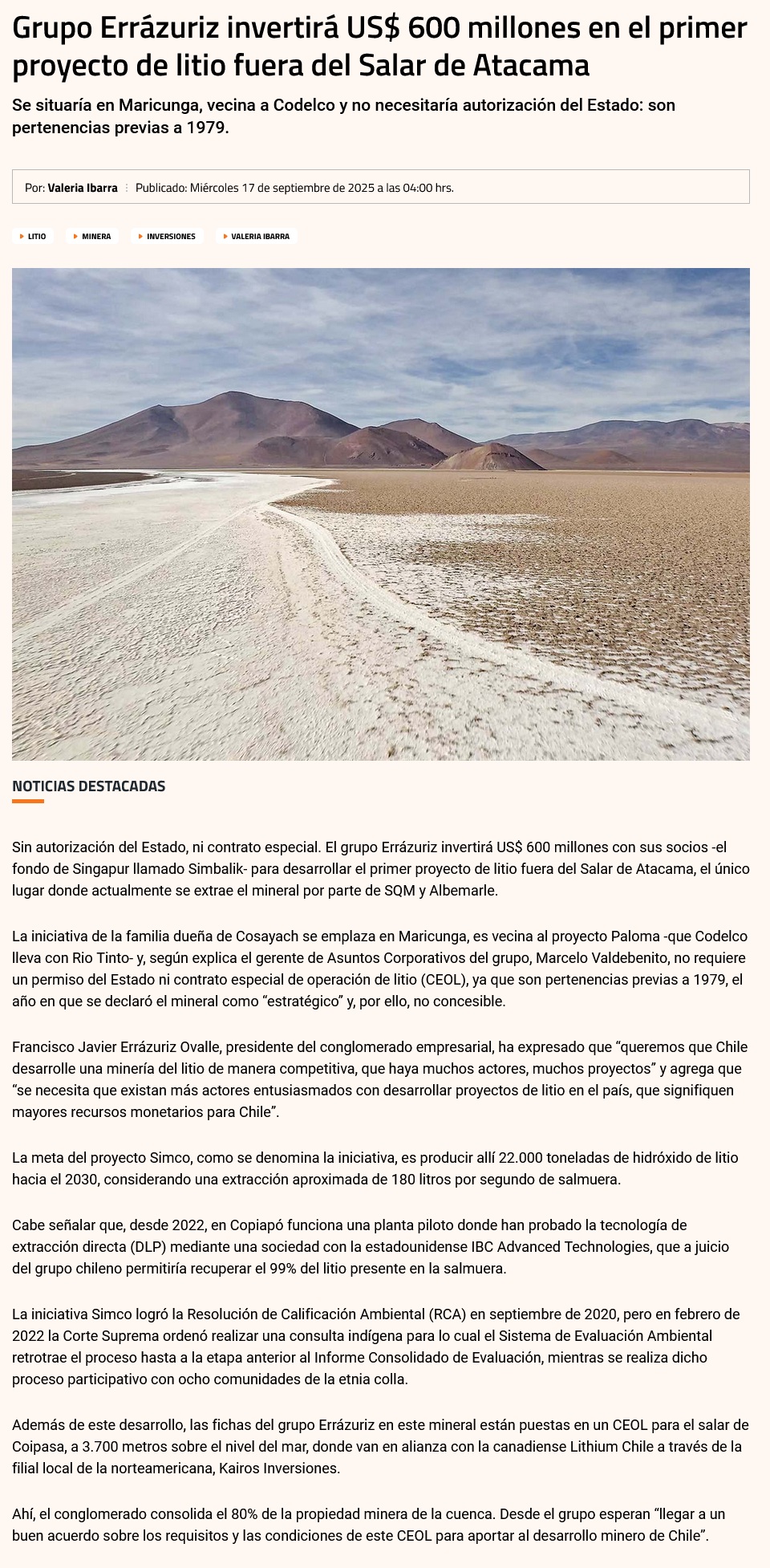 Grupo Errázuriz invertirá US$ 600 millones en proyecto de litio en Maricunga sin autorización del Estado - (El Chañarcillo)