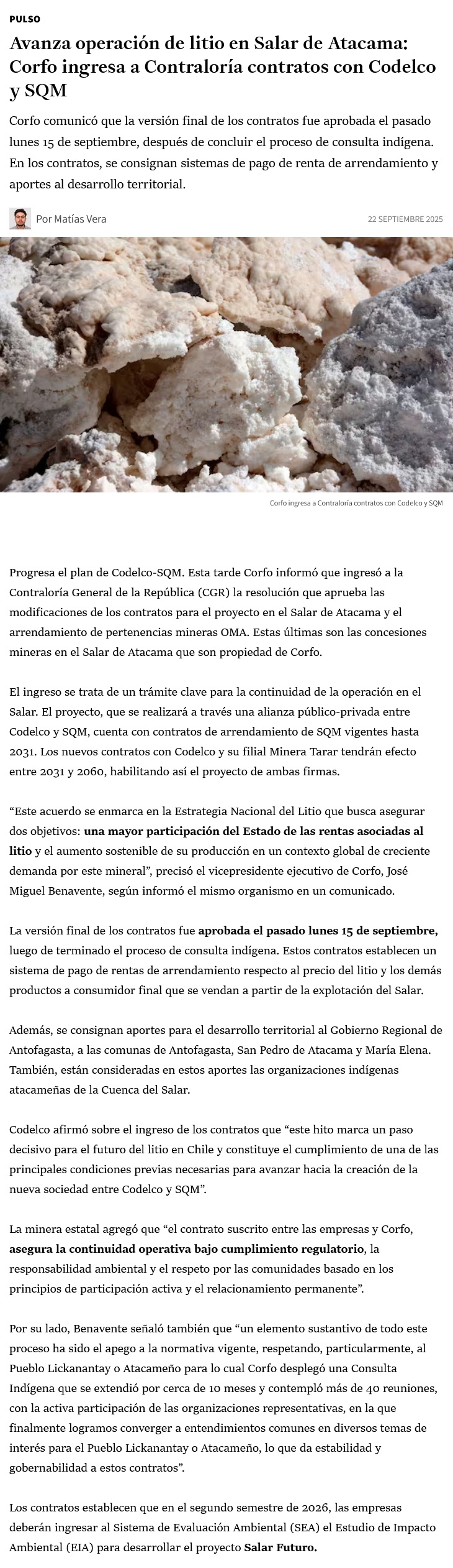 Salar de Atacama: Corfo ingresa a Contraloría contratos con Codelco y SQM - (Pulso)