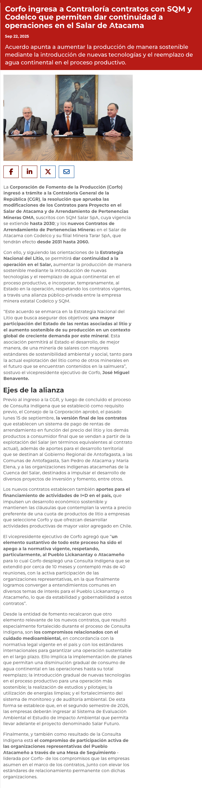 Salar de Atacama: Corfo ingresa a Contraloría contratos con Codelco y SQM - (Pulso)