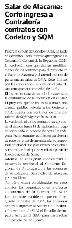 Avanza operación de litio en Salar de Atacama: Corfo ingresa a Contraloría contratos con Codelco y SQM - (La Tercera Online)