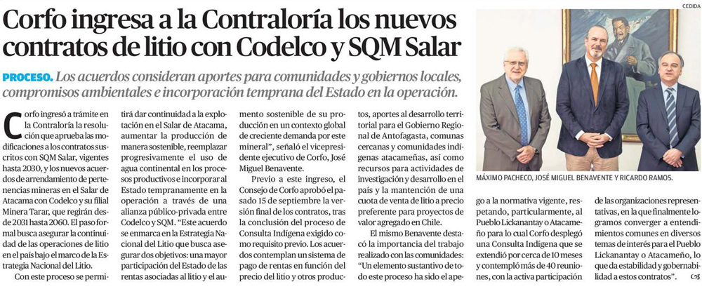 Corfo ingresa a la Contraloría los nuevos contratos de litio con Codelco y SQM Salar - (El Mercurio de Calama)