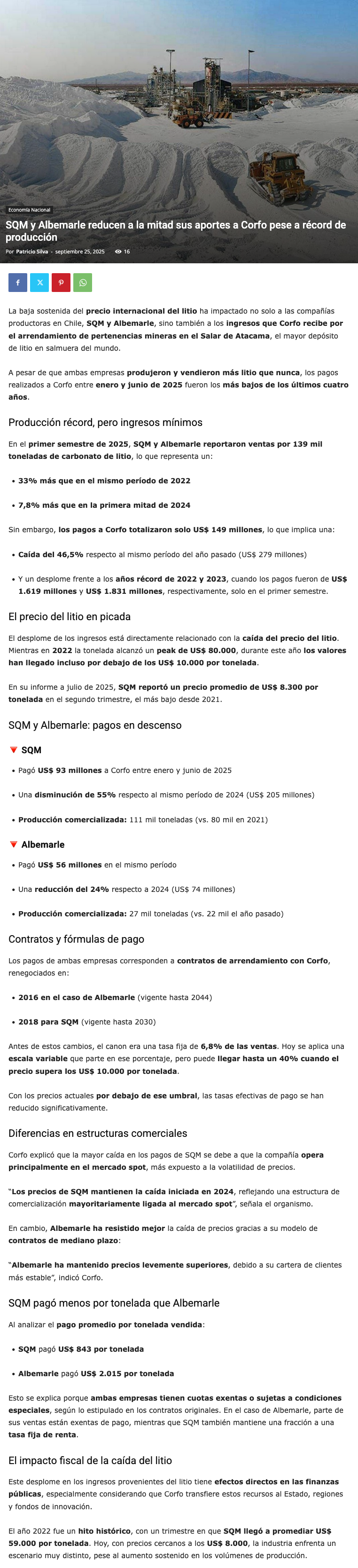 Por baja en precio del litio: pagos de SQM y Albemarle a Corfo se reducen cerca del 50% - (soyantofagasta)