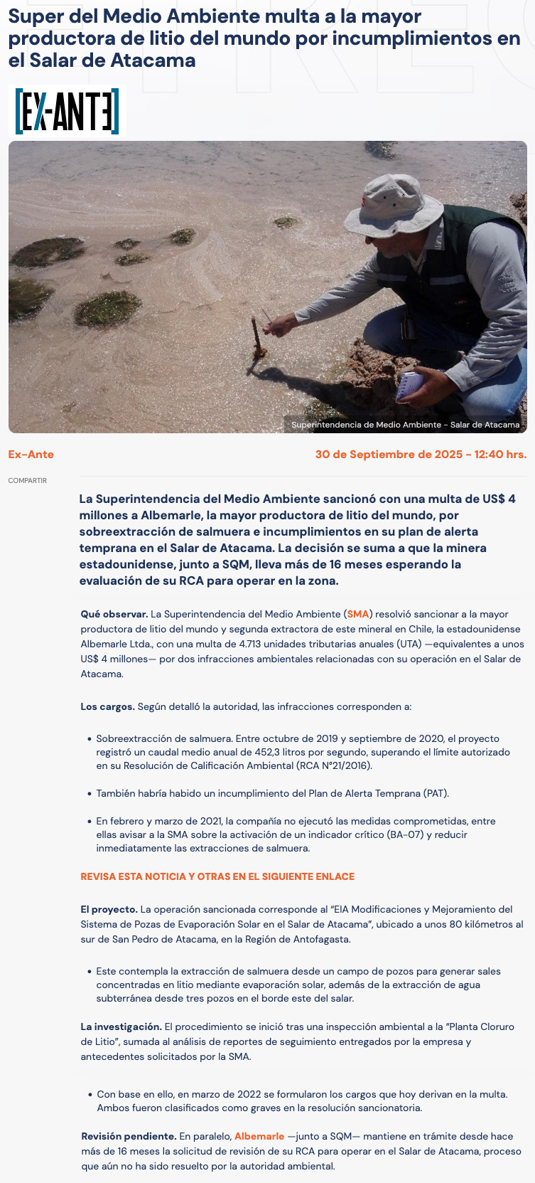 Super del Medio Ambiente multa a la mayor productora de litio del mundo por incumplimientos en el Salar de Atacama - (ex-ante.cl)