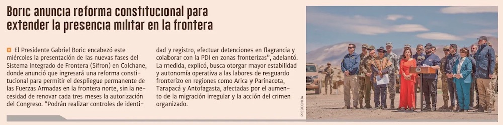 Boric anuncia reforma constitucional que permitirá desplegar FF.AA. en fronteras por decreto - (La Tercera)