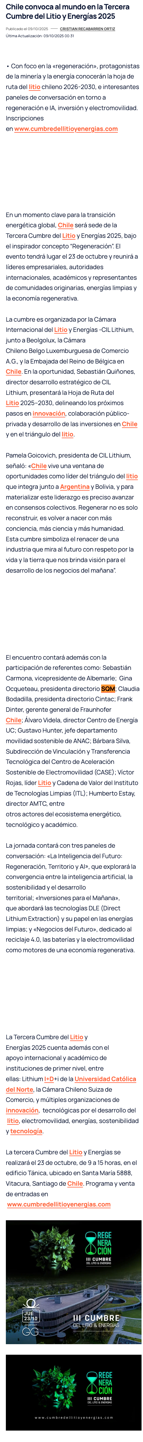 Chile será sede de la Tercera Cumbre del Litio y Energías 2025 bajo el lema “Regeneración” - (mineriayfuturo.cl)