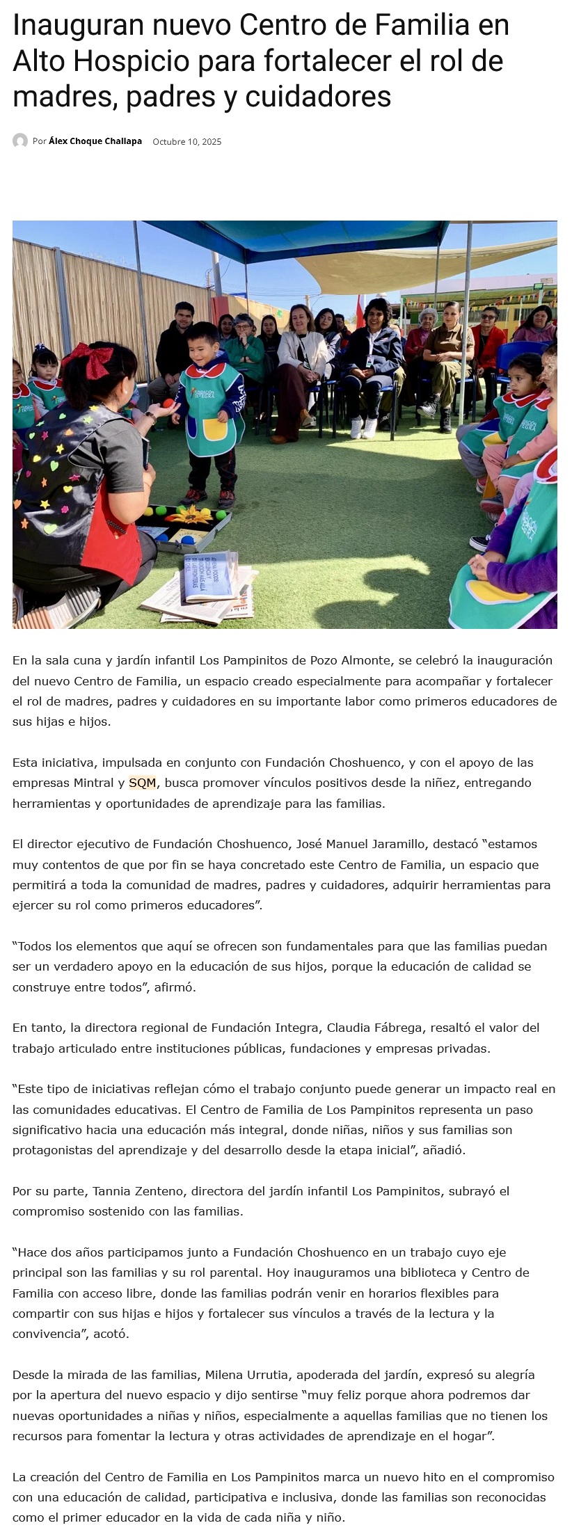 Inauguran nuevo Centro de Familia en Pozo Almonte para fortalecer el rol parental desde la primera infancia - (El Longino de Iquique)
