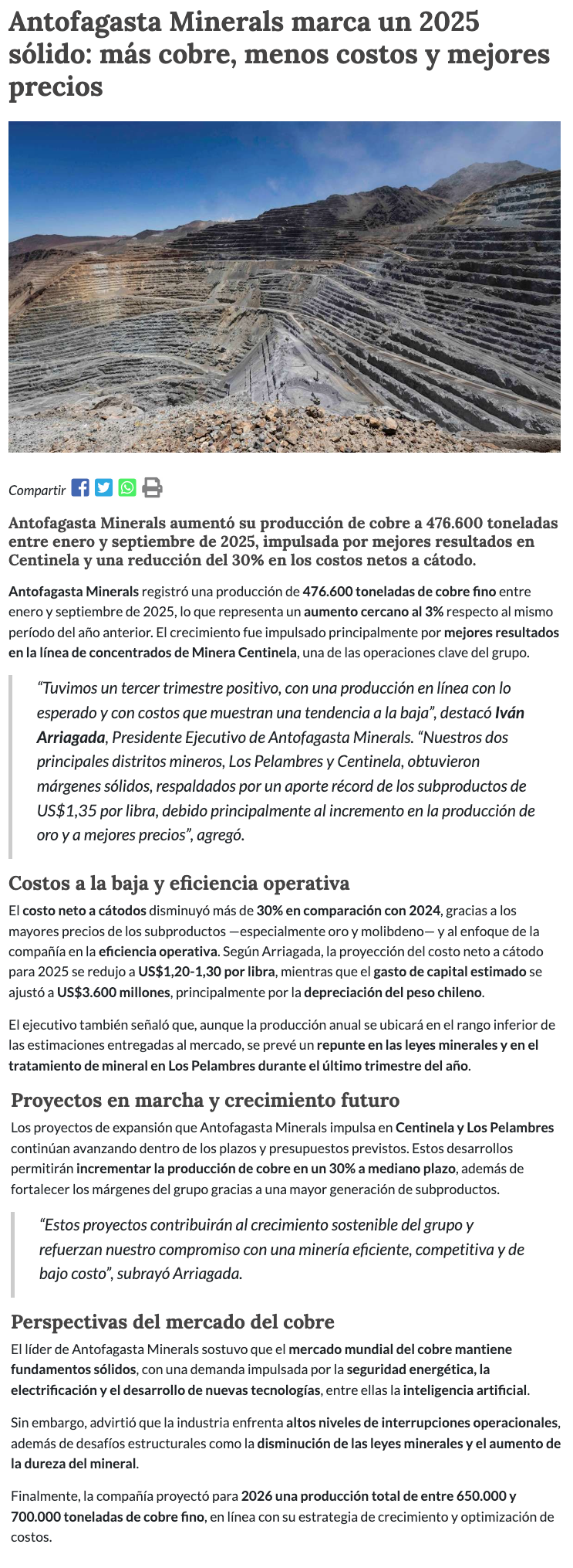 Producción de cobre de Antofagasta Minerals llegó a 476.000 toneladas al tercer trimestre de este año - (electromineria.cl)