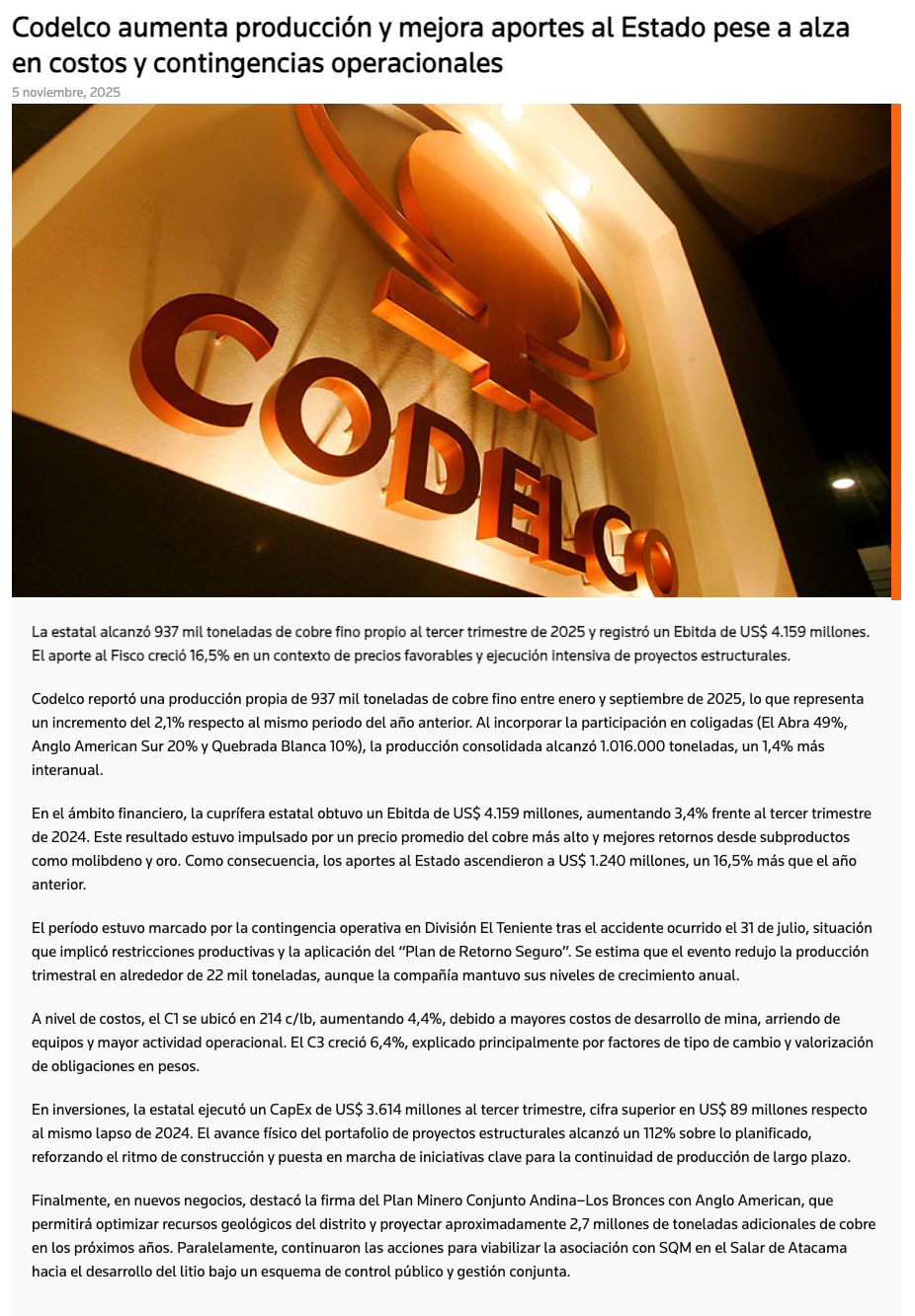 937 mil toneladas produjo Codelco, subiendo el Ebitda y también el aporte fiscal al tercer trimestre de 2025 - (revistacrisol.cl)