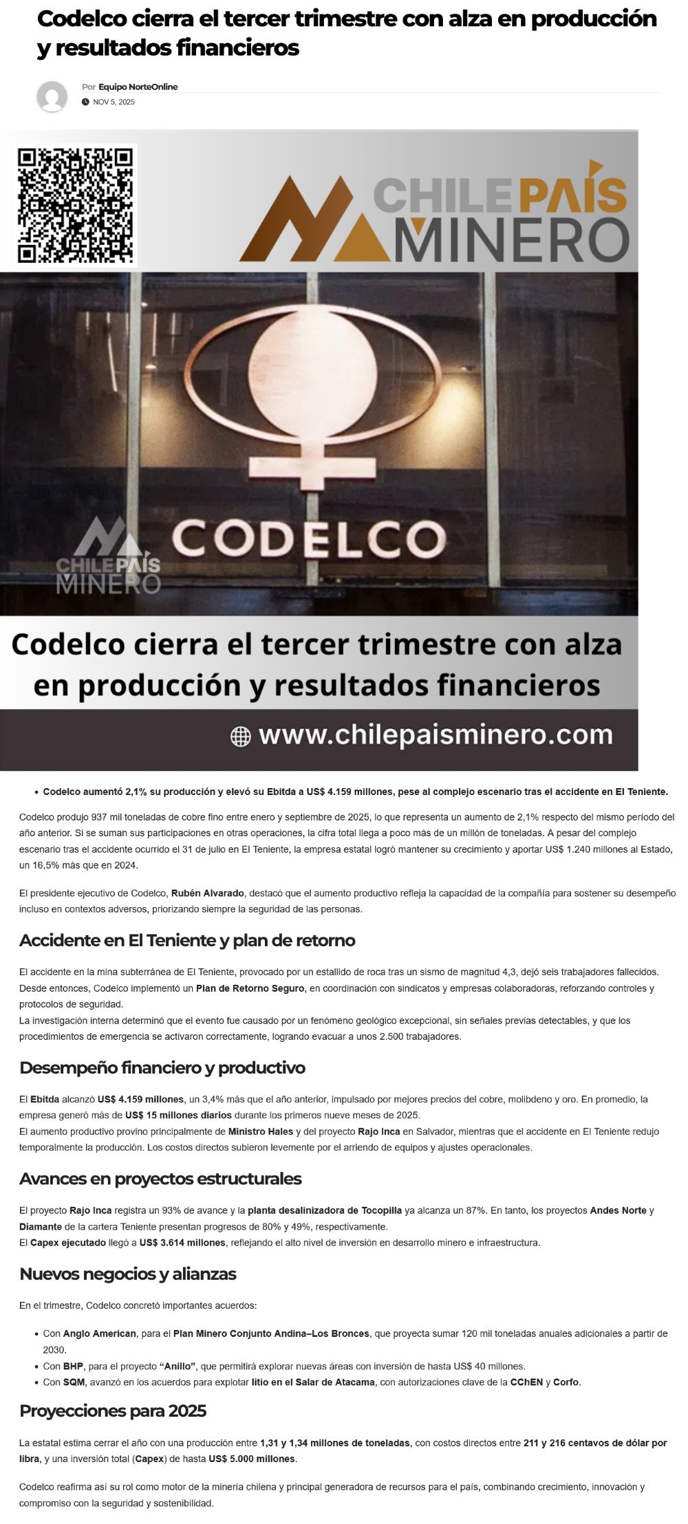 937 mil toneladas produjo Codelco, subiendo el Ebitda y también el aporte fiscal al tercer trimestre de 2025 - (revistacrisol.cl)