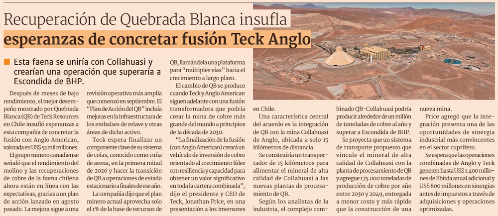 Recuperación de Quebrada Blanca insufla esperanzas de concretar fusión Teck Anglo y crearía en Chile la mayor mina de cobre del mundo - (DF Online)