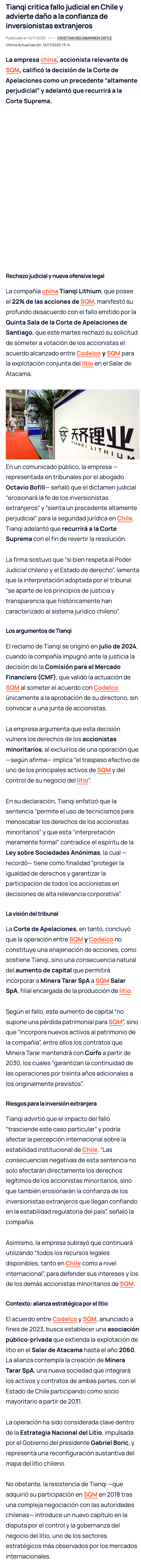 Tianqi dispara con todo contra decisión judicial que visa acuerdo Codelco-SQM: afecta a la minera, a los minoritarios y hasta a la inversión extranjera - (DF Online)