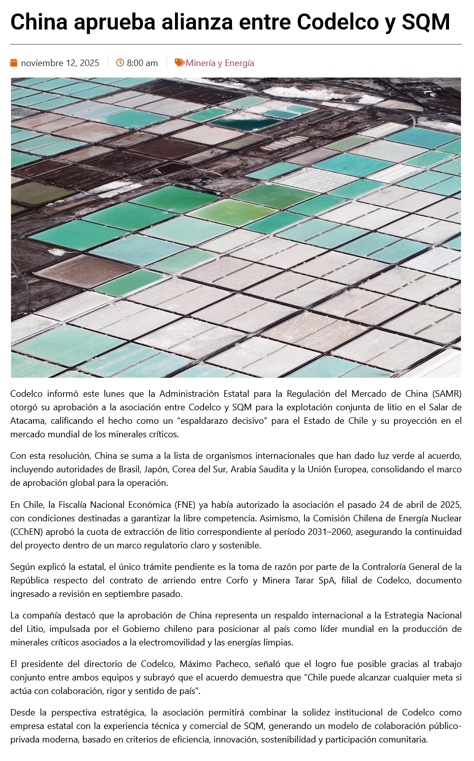 «Buena noticia»: Gobierno celebra aprobación de China al acuerdo de Codelco y SQM por Salar de Atacama - (chanarcillo.cl)