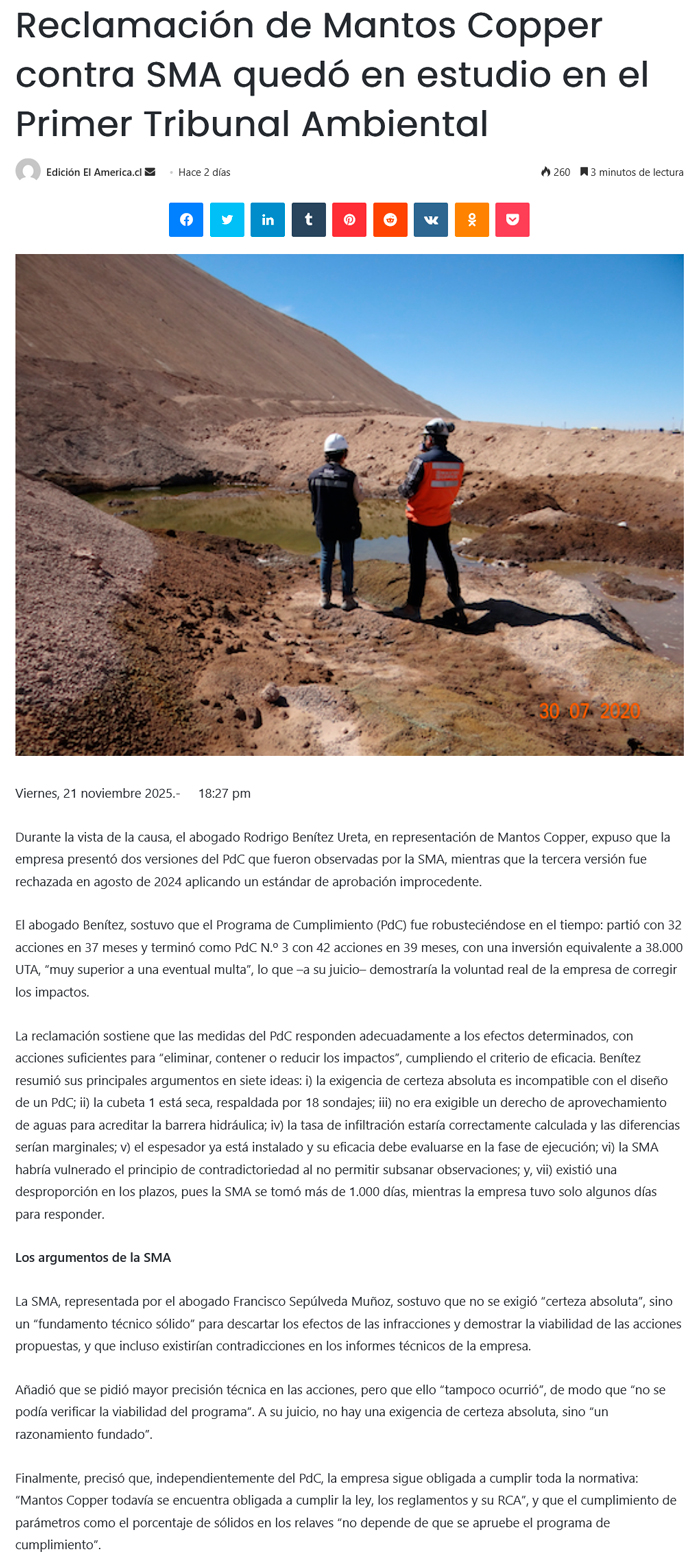Mantos Copper y la SMA se enfrentan en 1TA por cuantioso Programa de Cumplimiento - (El Mercurio de Antofagasta)