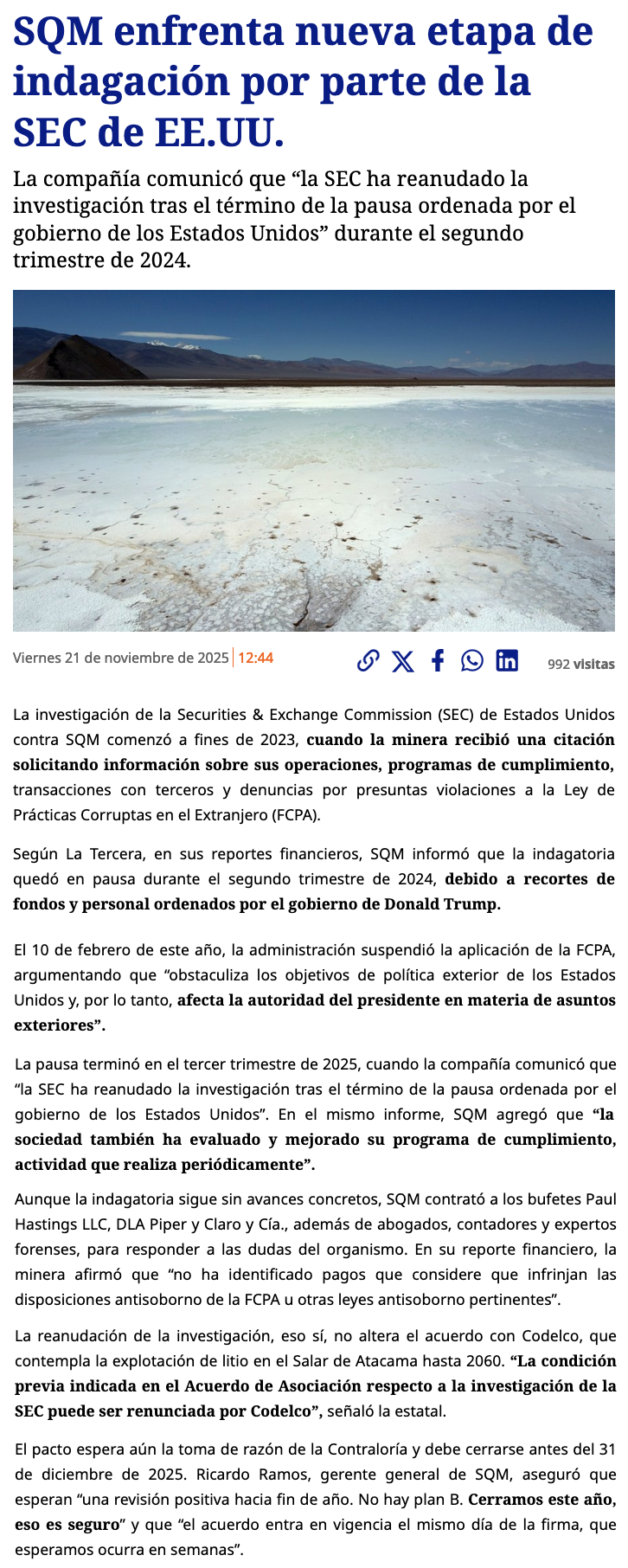 La SEC reanuda investigación a SQM y Codelco evalúa renunciar a la condición previa del acuerdo por el litio - (redimin)