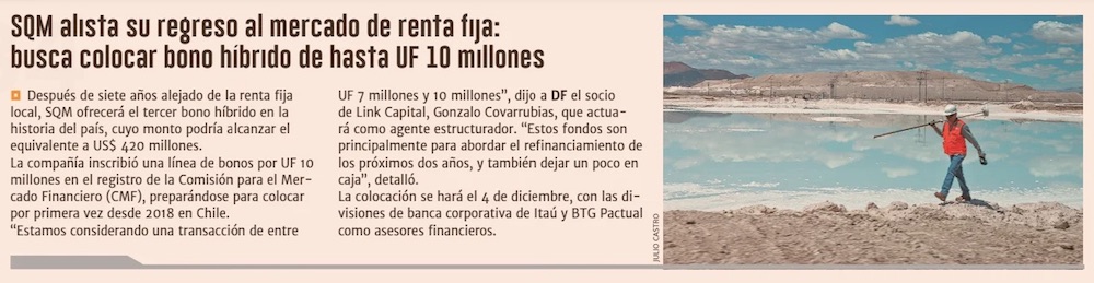 SQM alista su regreso al mercado de capitales chileno: planea colocar un bono híbrido de hasta UF 10 millones la próxima semana - (DF Online)