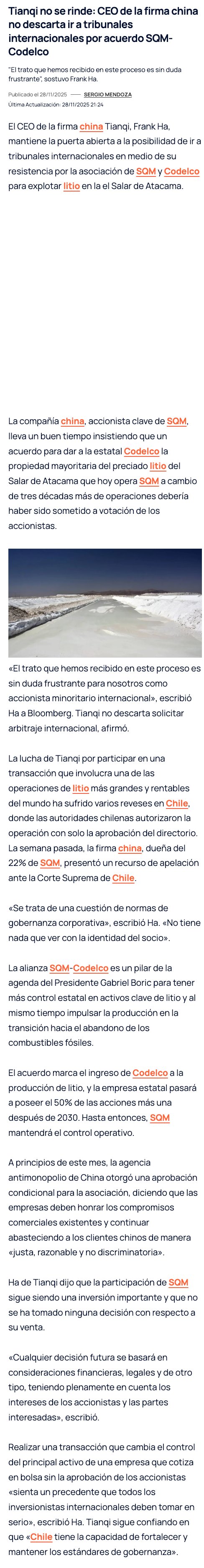 CEO de Tianqi evalúa recurrir ante tribunales internacionales por acuerdo SQM-Codelco - (El Mercurio de Santiago)