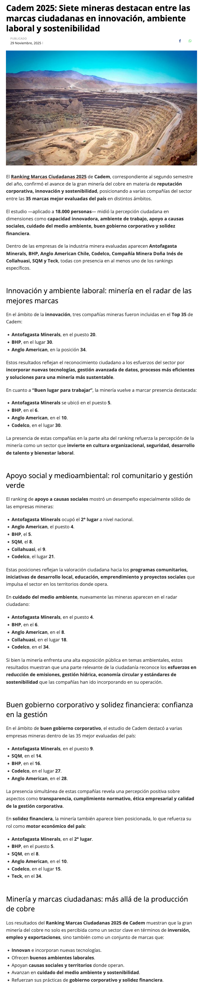 Cadem: ranking de marcas ciudadanas 2025 deja a seis empresas mineras en TOP 35 en cinco ámbitos - (electromineria.cl)