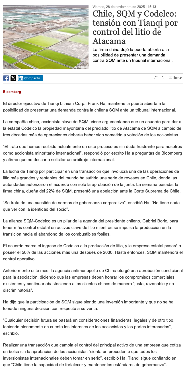 Tianqi mantiene la puerta abierta a un arbitraje internacional contra SQM - (bloomberglinea.com)
