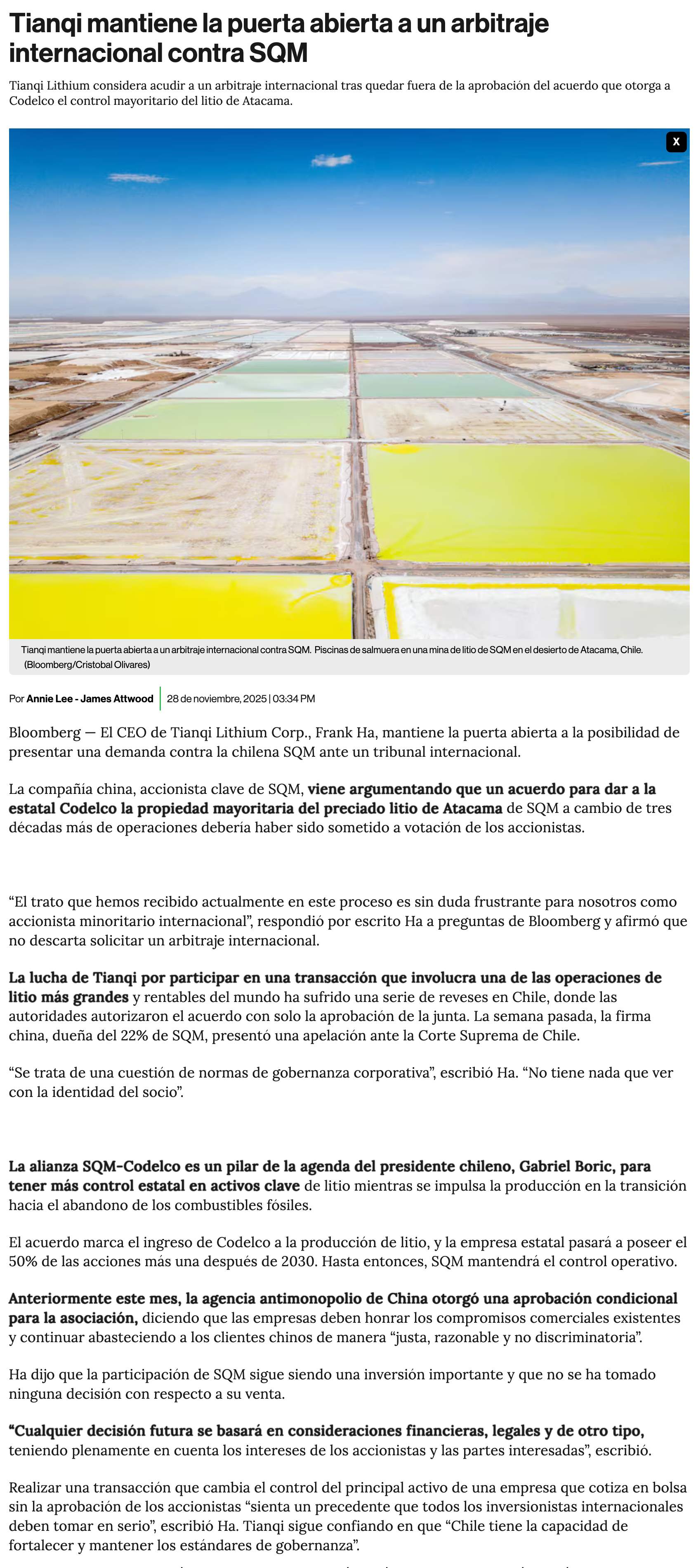 Tianqi no se rinde: CEO de la firma china no descarta ir a tribunales internacionales por acuerdo SQM-Codelco - (redimin)