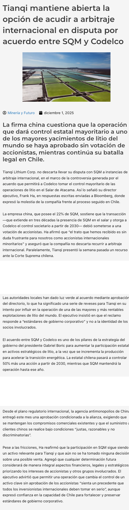 Tianqi Lithium considera acudir a arbitraje internacional por acuerdos entre SQM y Codelco - (redimin)