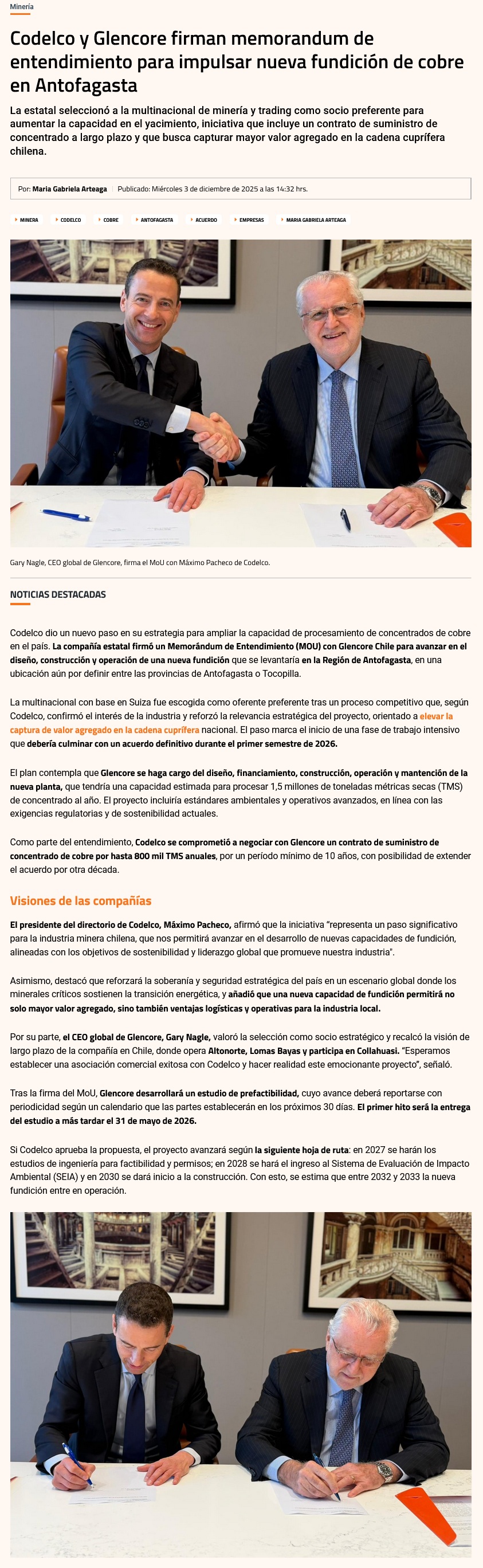 Codelco y Glencore firman acuerdo para impulsar nueva fundición en Antofagasta - (Diario Financiero)