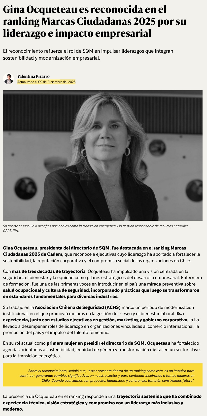 Gina Ocqueteau es reconocida en Ranking Marcas Ciudadanas 2025 por liderazgo e impacto empresarial - (guiaminera.cl)