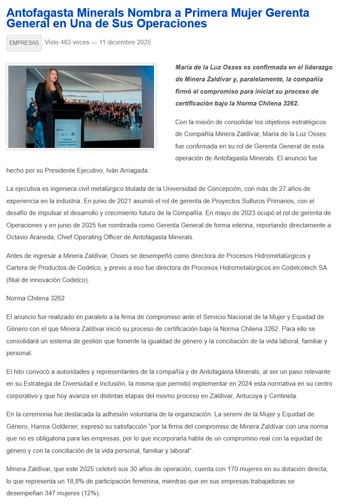 Antofagasta Minerals ratifica a María De La Luz Osses como gerenta general de Minera Zaldívar - (El Mercurio de Santiago)
