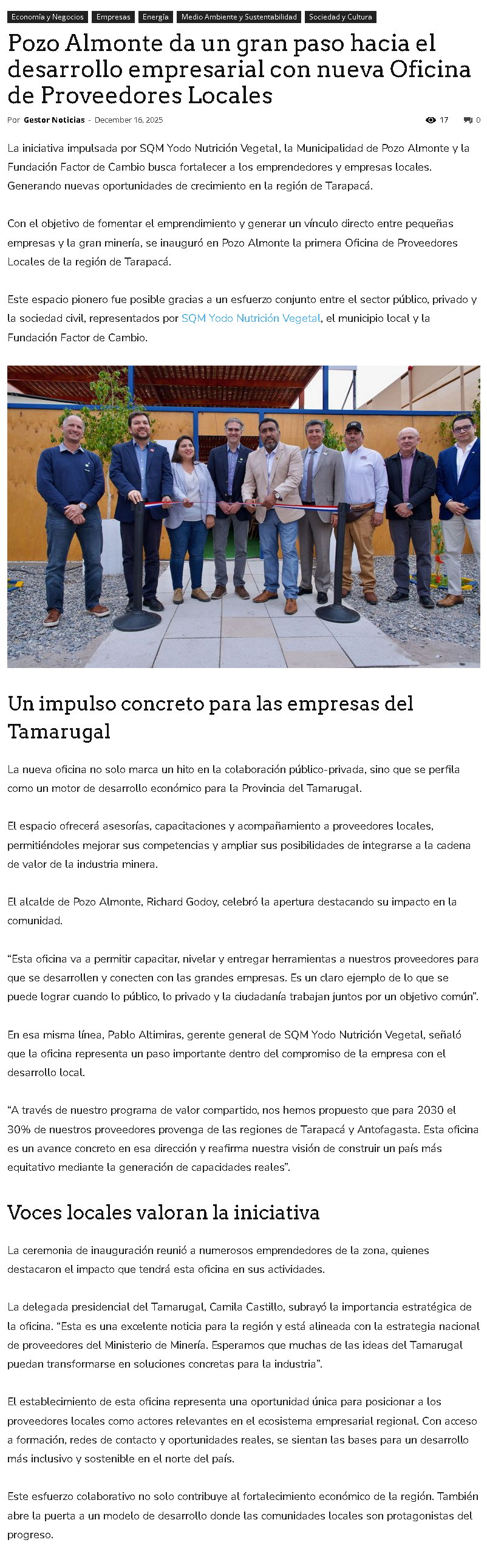 SQM Yodo Nutrición Vegetal impulsa la primera oficina de proveedores locales en Pozo Almonte - (El Mercurio de Santiago)