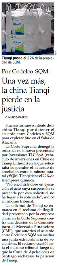Corte Suprema rechaza recurso de ilegalidad presentado por Tianqi y viabiliza acuerdo Codelco-SQM - (Diario Financiero)