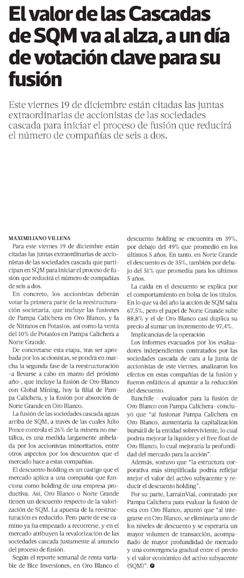El valor de las Cascadas de SQM va al alza, a un día de votación clave para su fusión - (La Tercera Online)