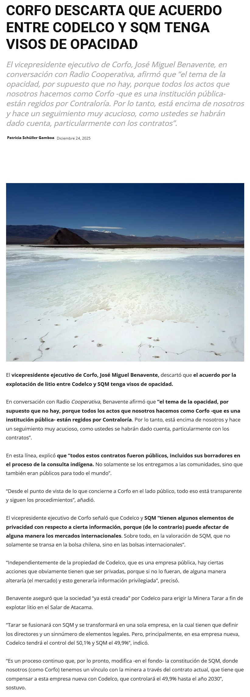 Acuerdo Codelco-SQM: Corfo descartó opacidad y resaltó esquema que evita "bache productivo" - (cooperativa online)