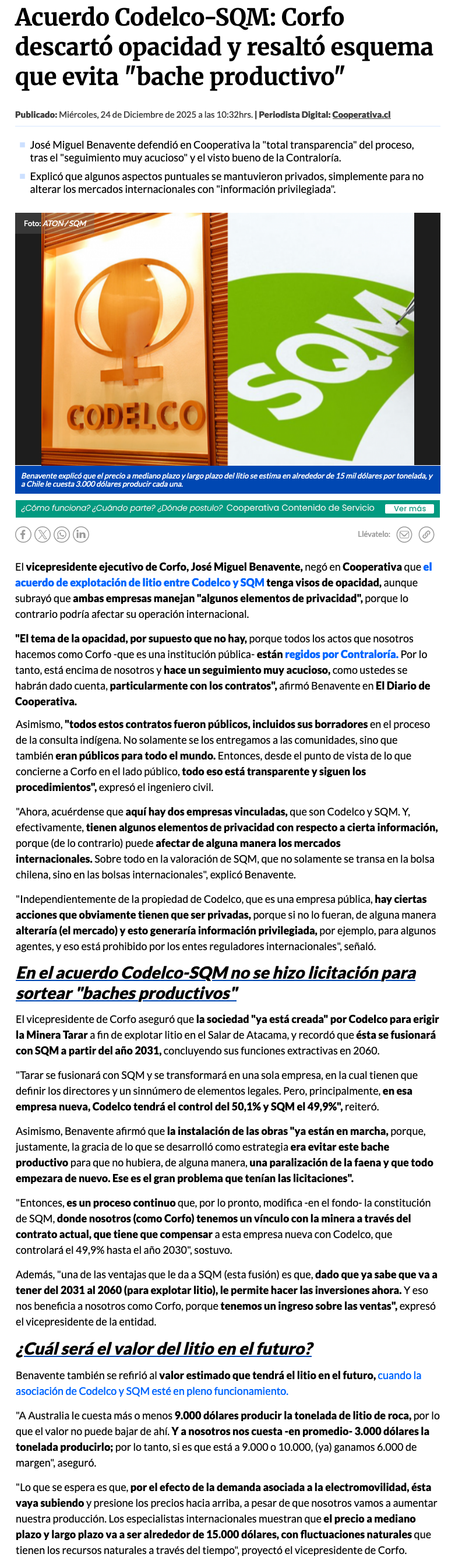 Corfo descarta que acuerdo entre Codelco y SQM tenga visos de opacidad - (24horas.cl)