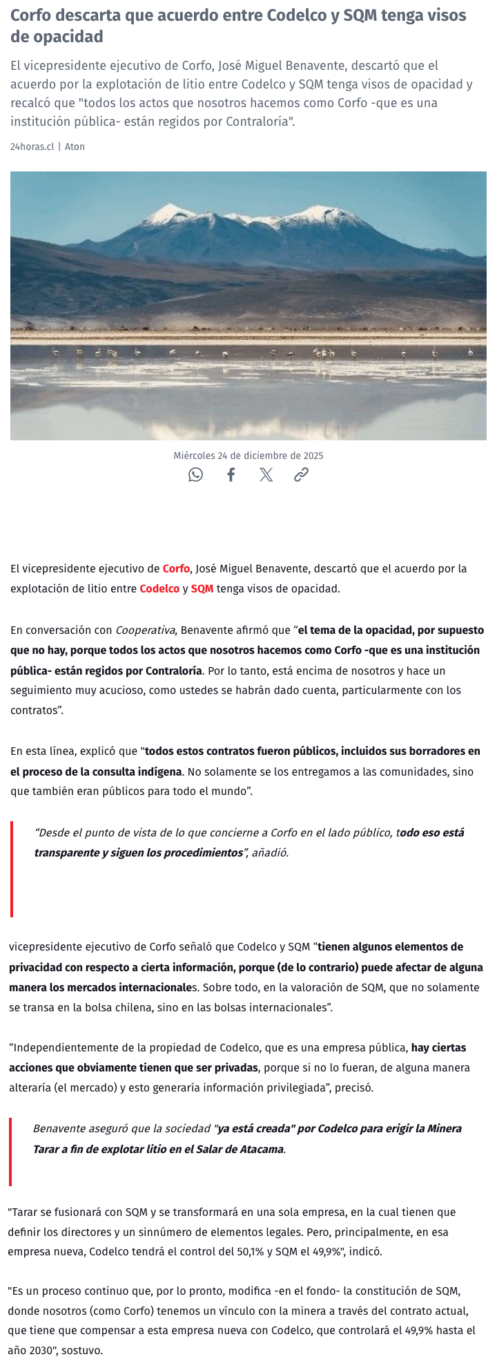 Acuerdo Codelco-SQM: Corfo descartó opacidad y resaltó esquema que evita "bache productivo" - (cooperativa online)